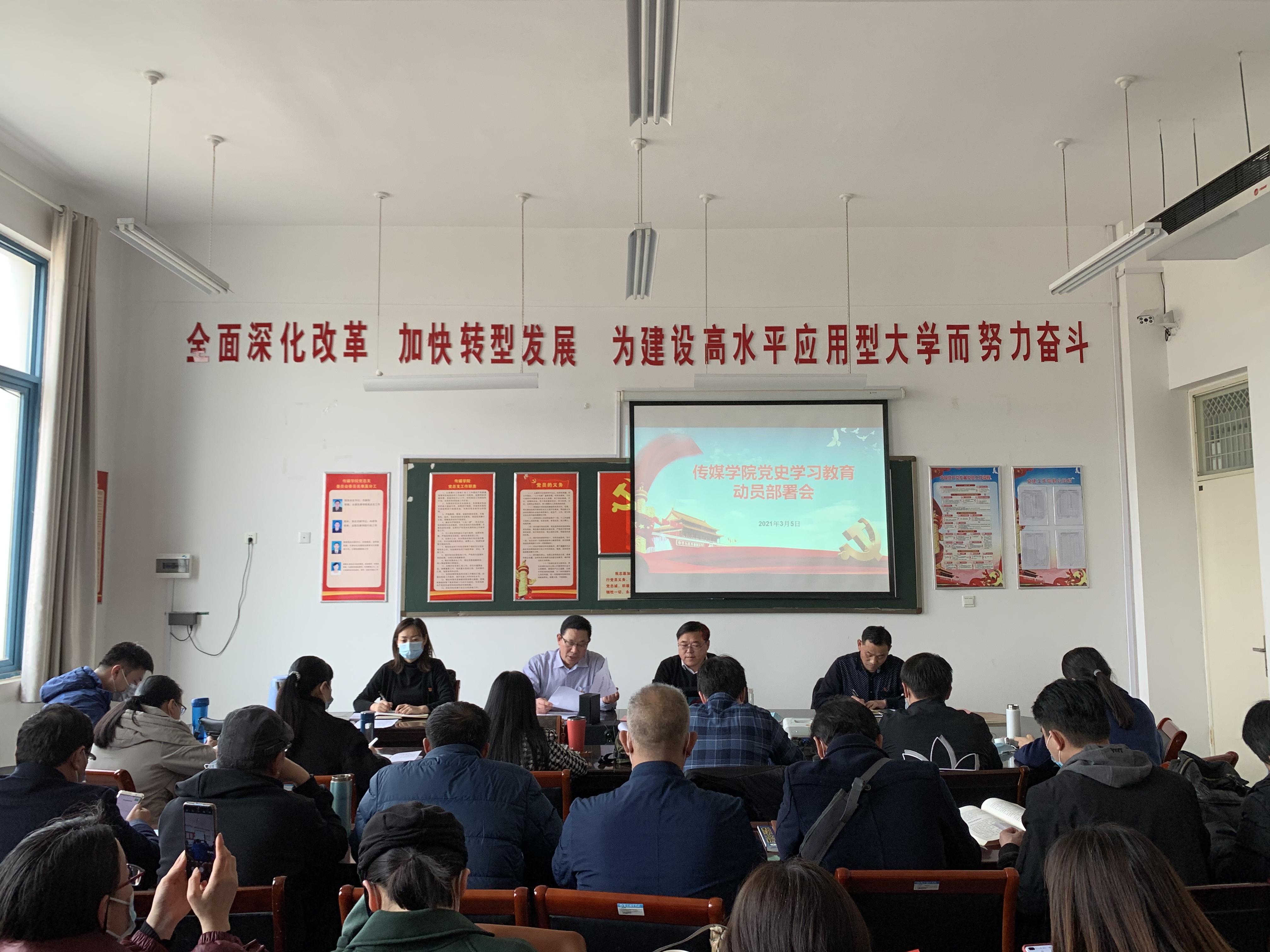为扎实开展党史学习教育,3月5日下午,传媒学院在汉梁楼343会议室召开党史学习教育动员部署会。传媒学院党总支书记沈振华、院长冉祥华、党总支副书记孟学超、副院长刘培培出席会议,传媒学院全体教职工参加会议。