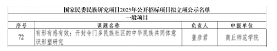 近日,国家民委科研项目管理办公室公布了2025年度国家民委民族研究项目立项结果,我院教师董彦君主持申报的“有形有感有效:开封寺门多民族社区的中华民族共同体意识形塑研究”获批一般项目,匹配项目经费3万元。这是我院首次获批国家民委项目。据悉,河南省共获6项,一般项目仅3项。