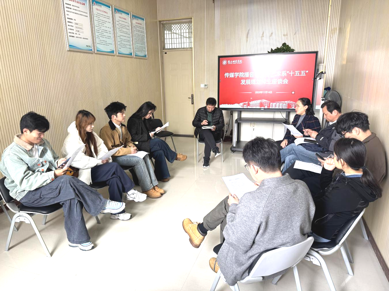 11月14日上午,播音与主持艺术系在汉梁楼446召开“十五五”发展规划师生座谈会,传媒学院院长杨春风、全系教师及学生代表参加座谈会。座谈会由系主任孙启良主持。