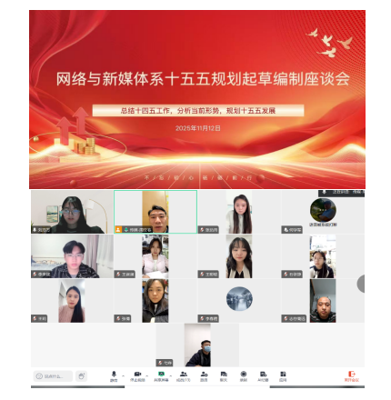 11月12日晚,网络与新媒体系通过线上会议形式召开“十五五”发展规划起草编制座谈会。传媒学院党总支副书记高原、全系教师及学生代表参会,会议由系主任周立春主持。