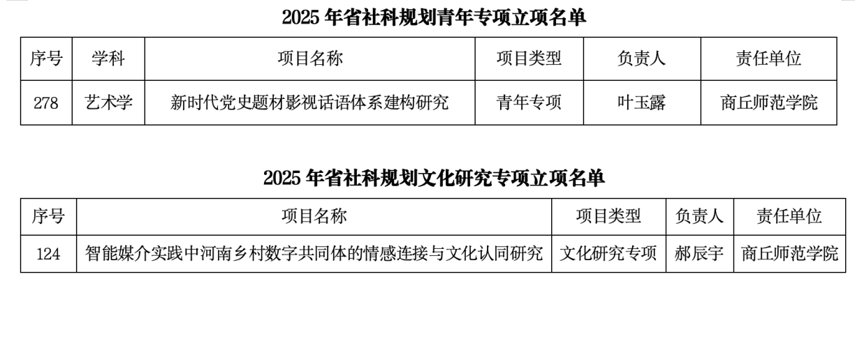 近日,河南省哲学社会科学工作事务中心公布了2025年度省社科规划项目立项名单。我院叶玉露老师主持申报的《新时代党史题材影视话语体系建构研究》获批青年项目立项;郝辰宇老师主持申报的《智能媒介实践中河南乡村数字共同体的情感连接与文化认同研究》获批文化研究专项立项。