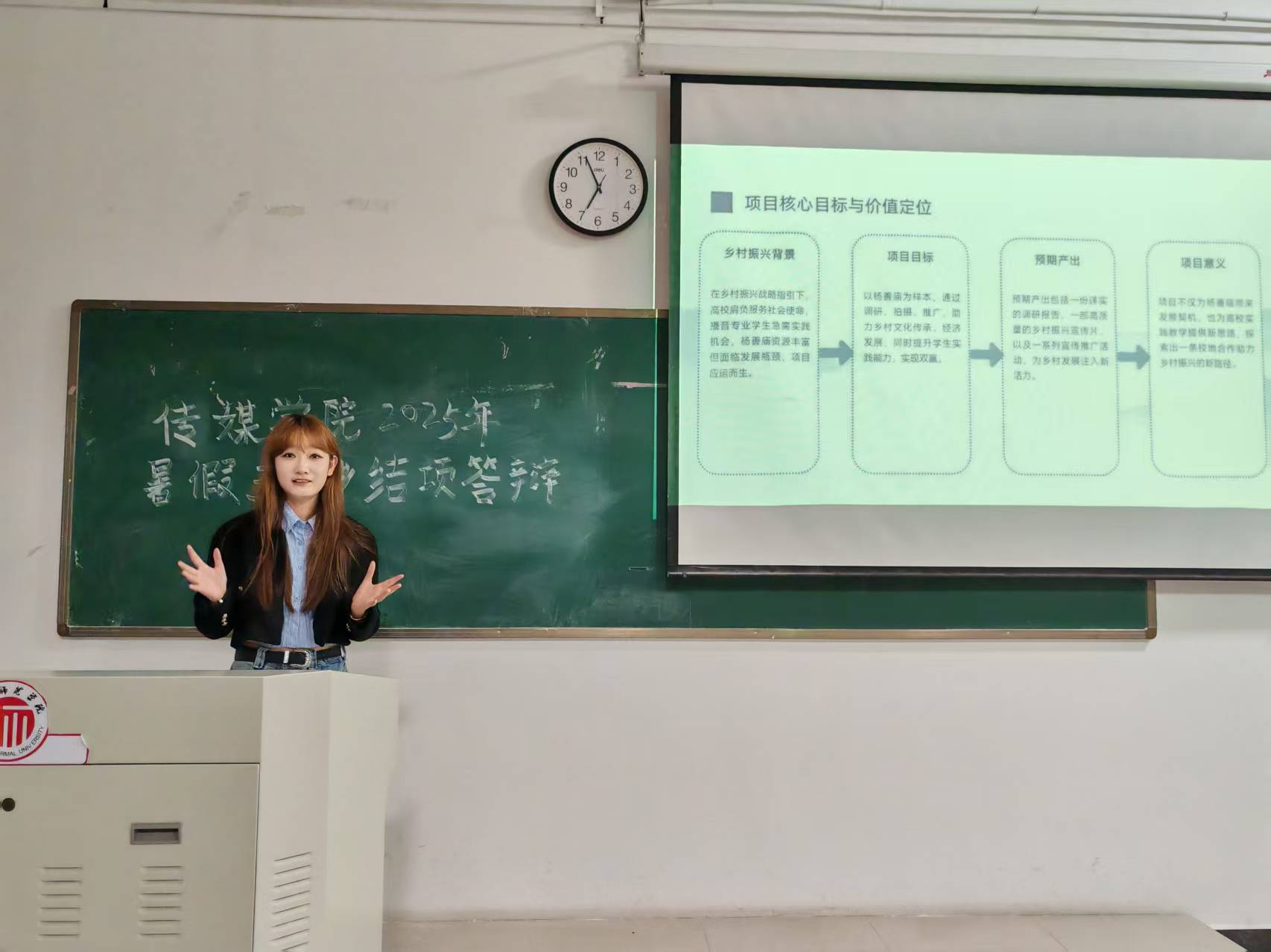 在答辩过程中,各团队通过精美的PPT展示、详实的数据分析和生动的现场讲解,全面呈现了暑期社会实践的精彩历程。有的团队深入乡村开展文化支教,通过新媒体技术为乡村孩子打开了解世界的窗口;有的团队聚焦非遗文化保护,运用专业技能记录和传播濒临失传的传统技艺;有的团队走进田间地头,用镜头和笔触描绘乡村振兴的生动图景;还有的团队针对基层群众需求,开展形式多样的志愿服务活动。每个项目都体现了传媒学子服务社会、奉献青春的责任担当,展示了将理论知识转化为实践能力的丰硕成果。
