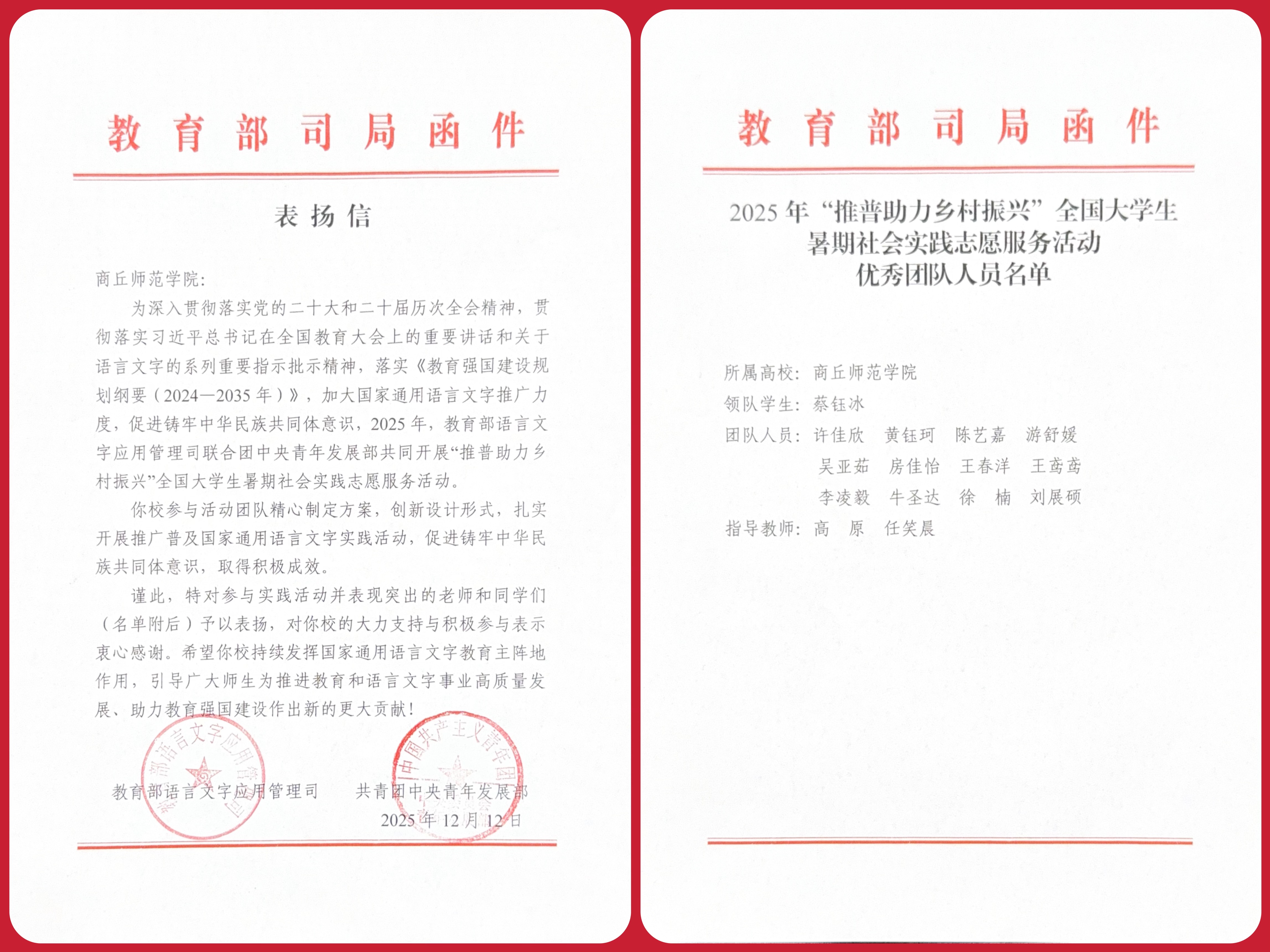近日,教育部语言文字应用管理司、共青团中央青年发展部联合向我校发来表扬信,高度肯定我校传媒学院“归德正音·四海共语”推普服务队对促进语言文字事业高质量发展、铸牢中华民族共同体意识、助力教育强国建设作出的贡献,对参与此次实践活动并表现突出的我校师生予以表扬,并对我校的大力支持与积极参与表示衷心感谢。